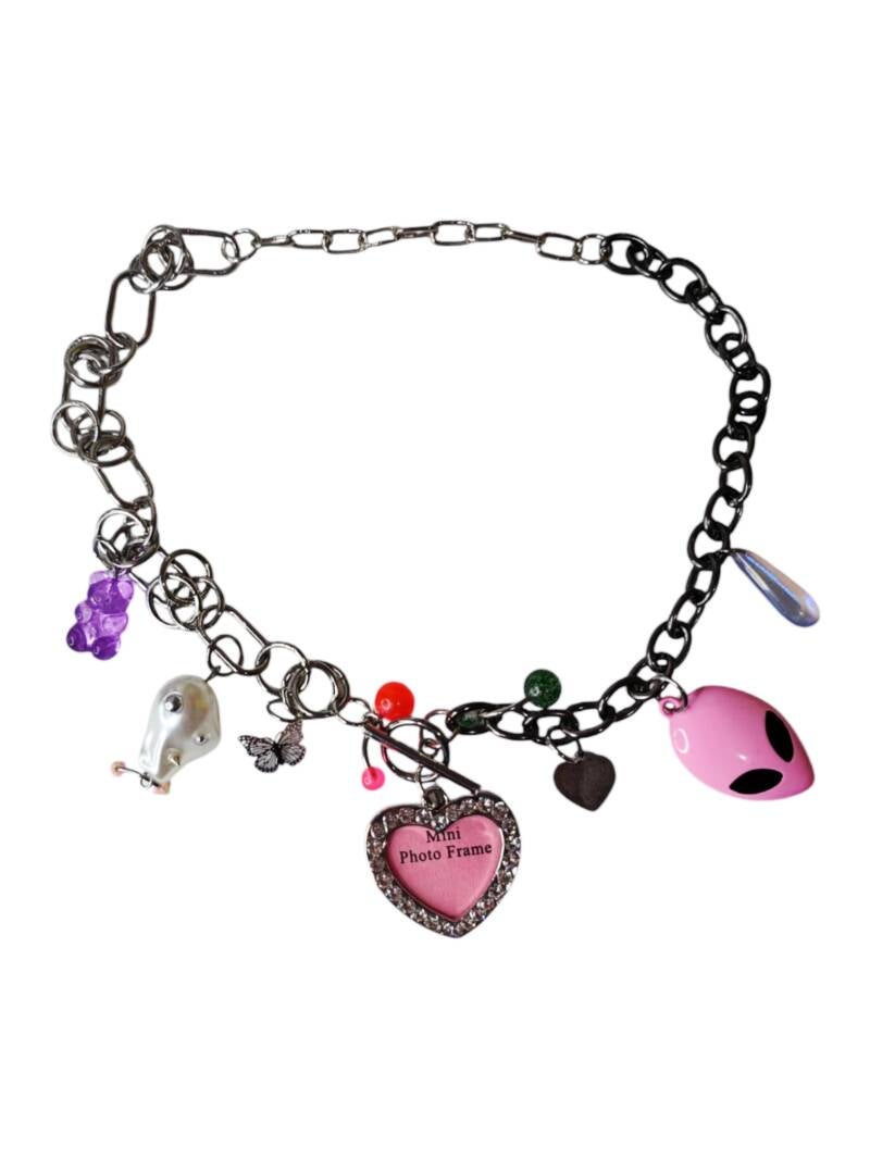Collar hecho a mano con cadenas de alta calidad en acero inoxidable estilo punk con charms de acero inoxidable plateado y un reloj waterproof en turquesa y rosa más piercing.