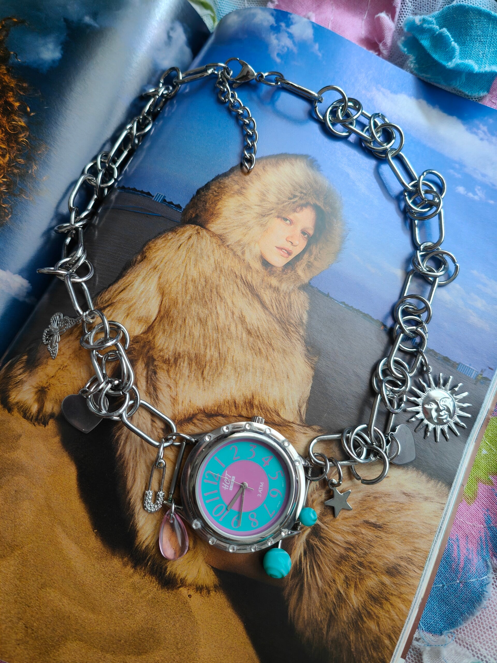 Collar hecho a mano con cadenas de alta calidad en acero inoxidable estilo punk con charms de acero inoxidable plateado y un reloj waterproof en turquesa y rosa más piercing.