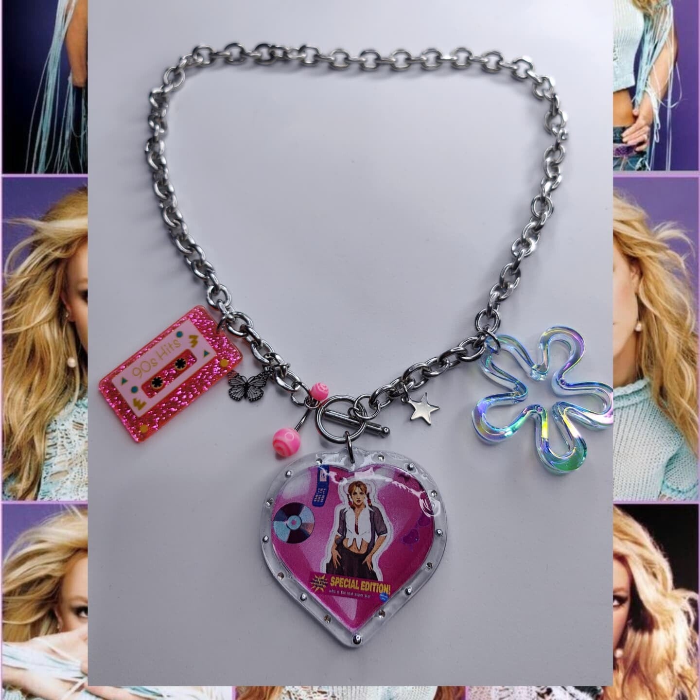 Collares con cadenas en acero inoxidable plateada, dijes con tu cantante favorita y charms en acrílico y acero.